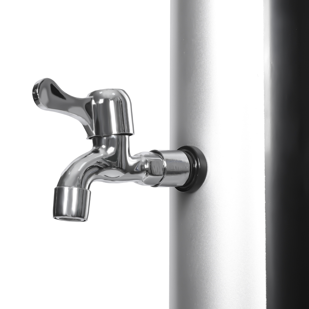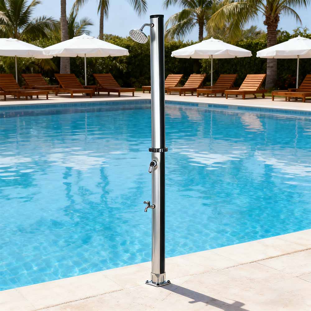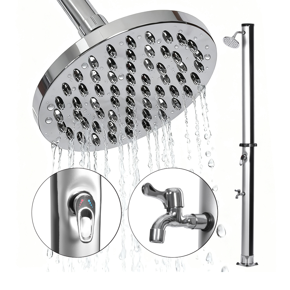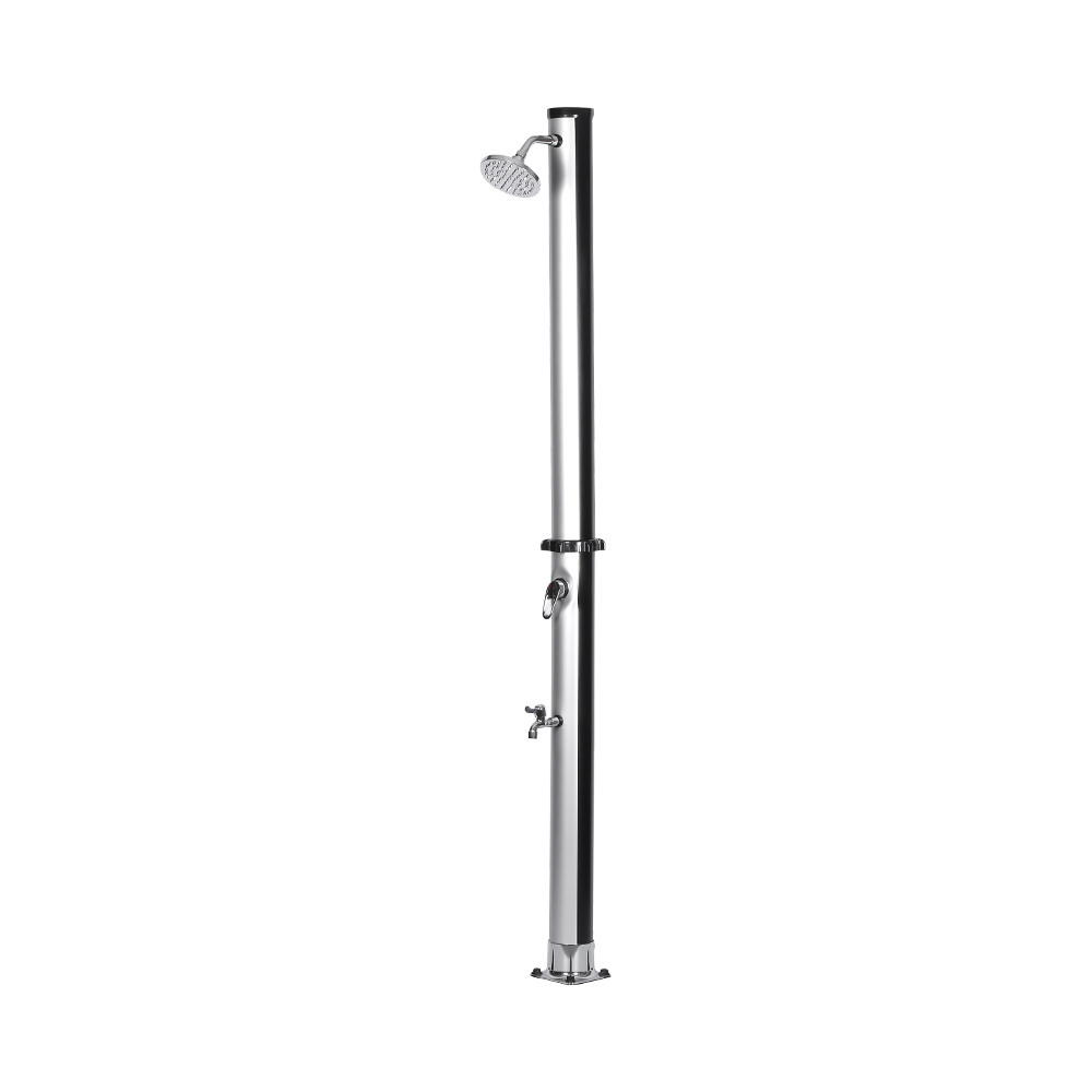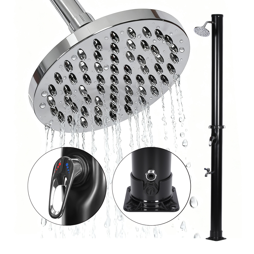 Conçue pour le confort extérieur, cette colonne de douche solaire extérieure en PVC de jardin LY18L01 18L avec base est idéale pour les jardins, les zones au bord de la piscine et le camping, représentant l'une des dernières innovations en matière de chauffage de l'eau sans apport d'énergie externe. Il permet un contrôle facile de la température de l'eau grâce à un mélangeur à levier unique qui mélange l'eau chauffée du tuyau de douche avec l'eau froide du tuyau, garantissant ainsi une expérience confortable. Construit avec une base en PVC durable pour une stabilité et un soutien fiables, il dispose également d'une grande pomme de douche à effet pluie avec un angle réglable de 180° via sa rotule intégrée, offrant un effet de refroidissement rafraîchissant. L'installation est rapide et simple, ce qui en fait un ajout pratique à divers environnements extérieurs.