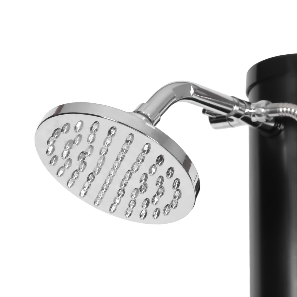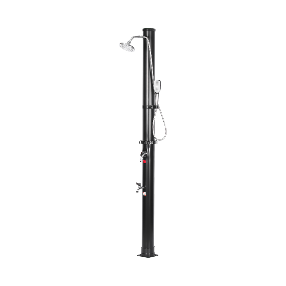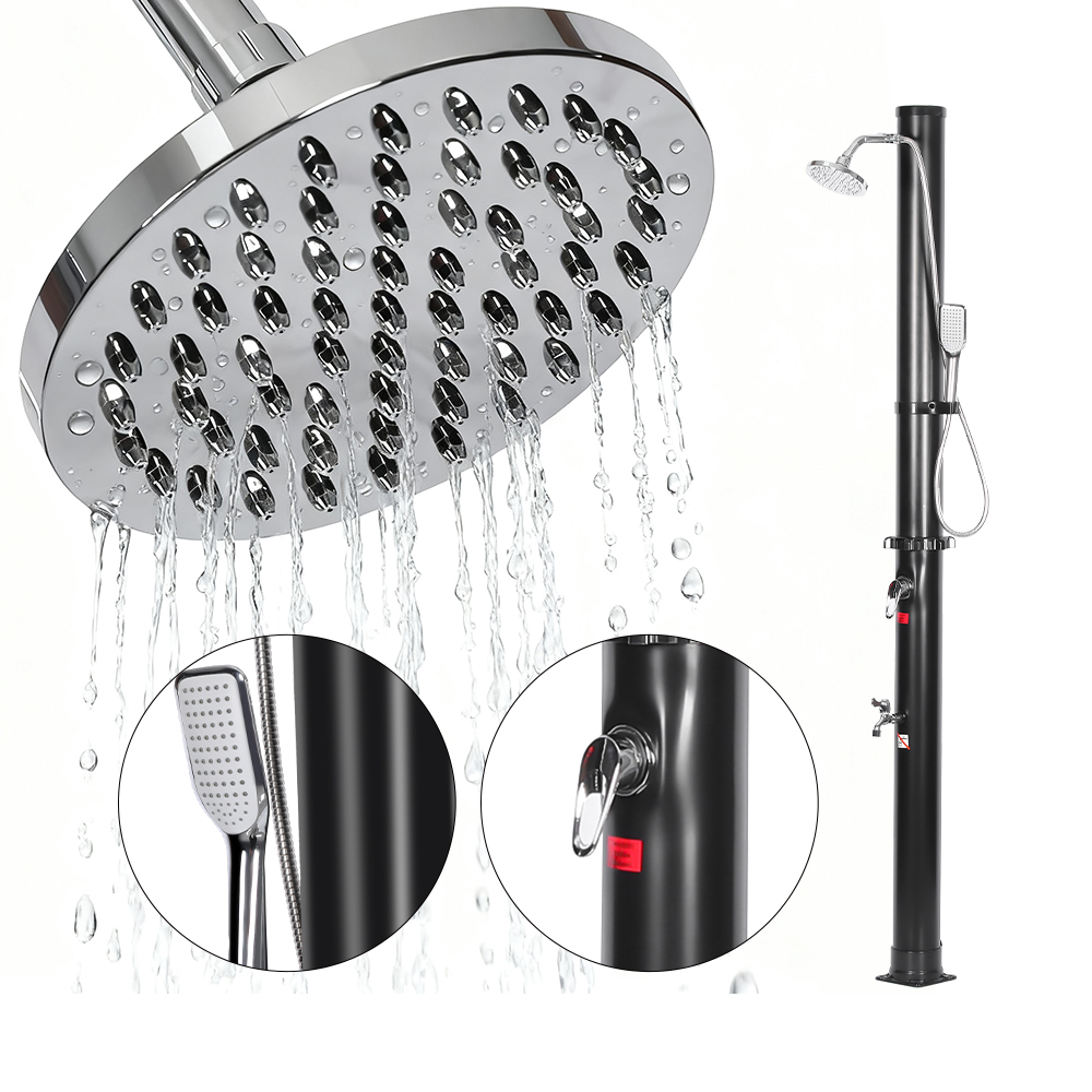 Cette douche solaire de jardin extérieure à deux sections en chrome ABS LY18L05-HB 18L comprend un raccord de tuyau d'arrosage pratique pour un remplissage facile et un bouchon de vidange qui permet une vidange rapide lors de la préparation de l'appareil pour le stockage hivernal. Une fois le tuyau de douche rempli, l'eau se réchauffe naturellement grâce à l'énergie solaire et le robinet mélangeur intégré facilite le réglage de l'eau à votre température préférée pour une expérience de douche confortable. Tous les composants sont solidement fixés avec des vis pour garantir la durabilité et, pour un fonctionnement sûr, la douche doit être correctement ancrée au sol. Des instructions claires et multilingues sont fournies pour vous guider tout au long de l'installation et de l'utilisation, rendant le processus de configuration simple et fiable.